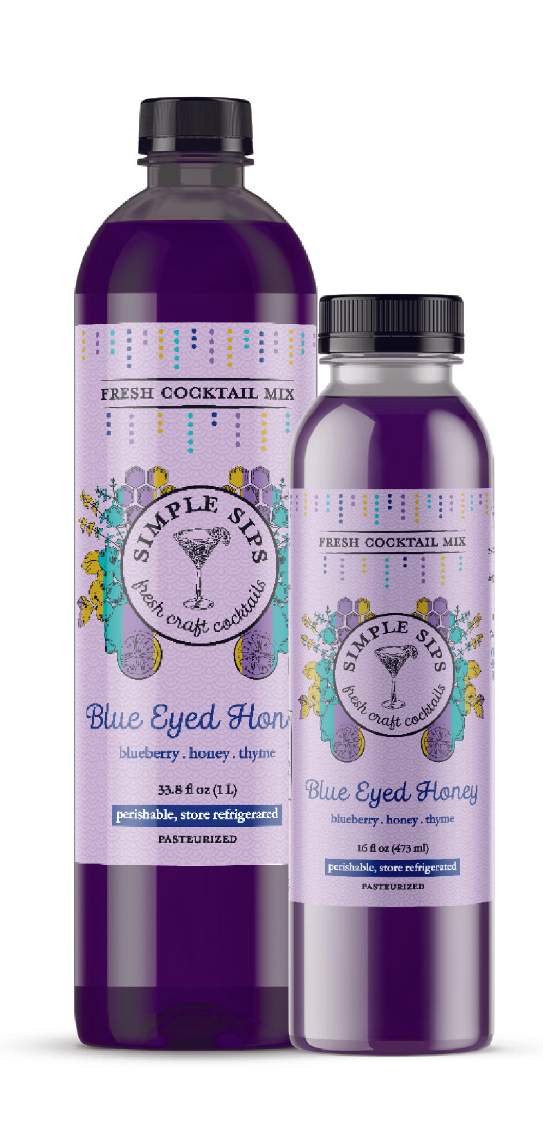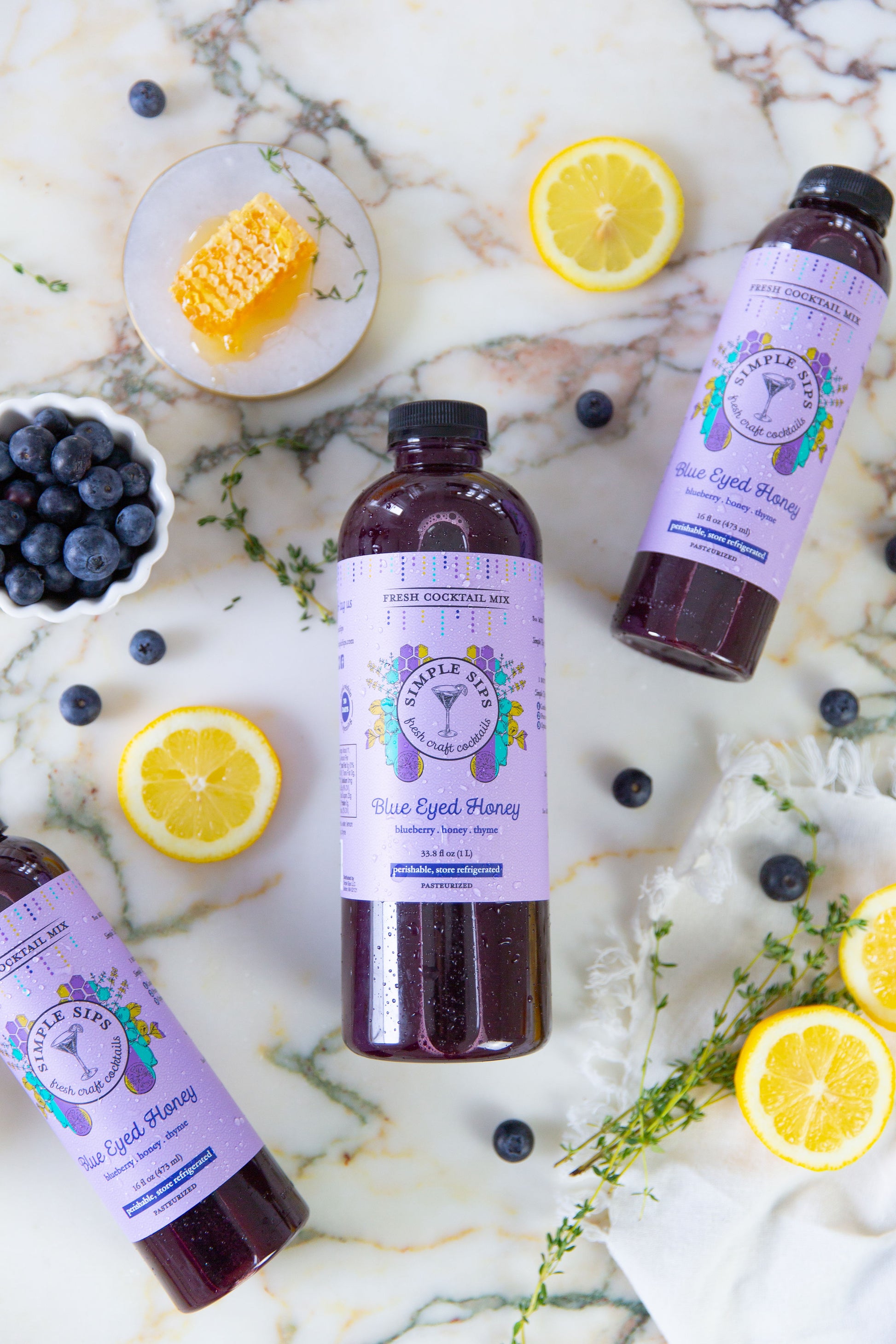- Blue Eyed Honey: blueberry, lemon, honey, thyme | best with rum, gin, anejo tequila, vodka, champagne or seltzer